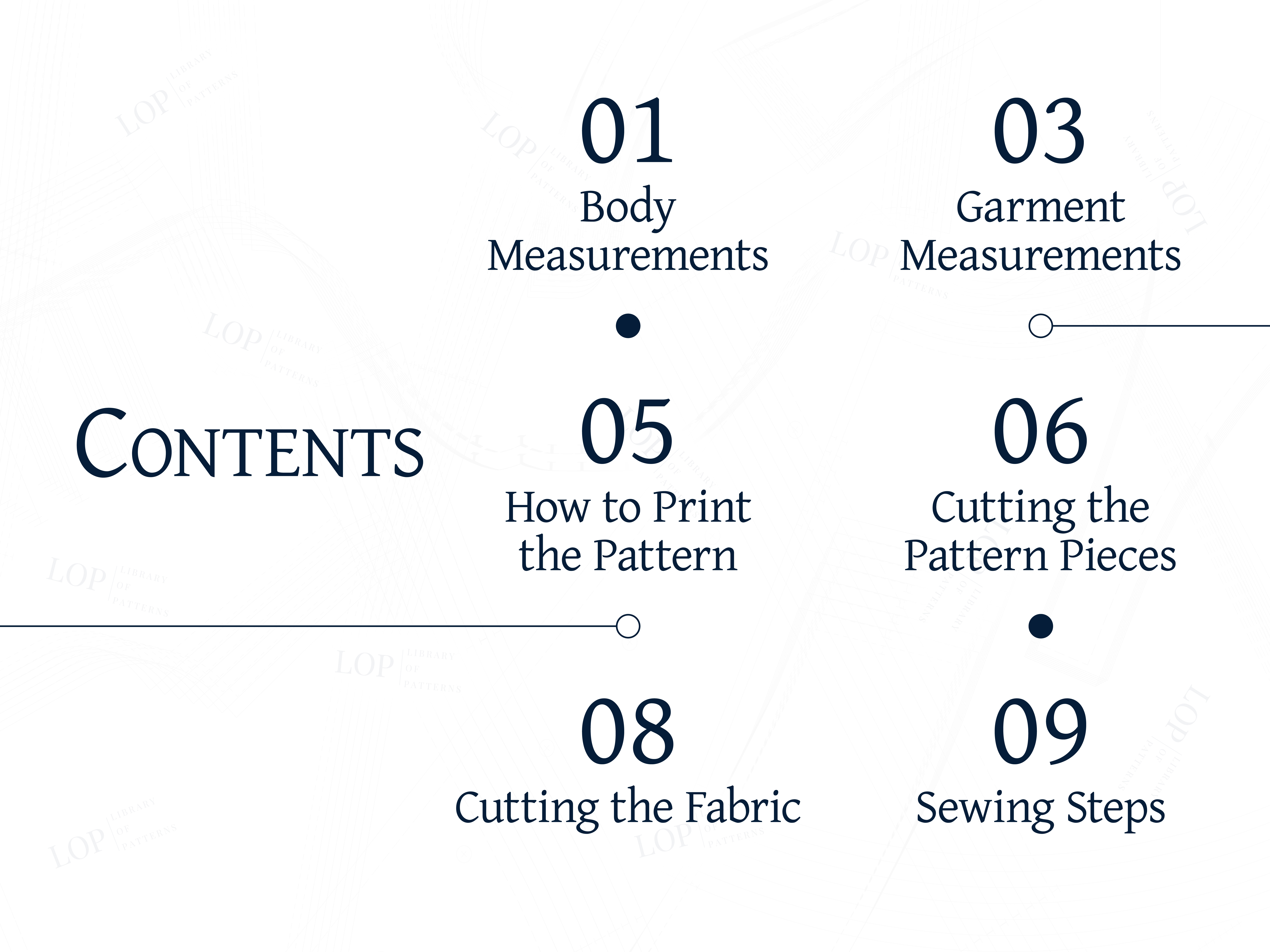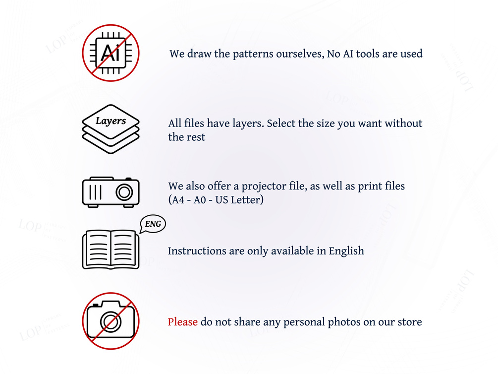 You will receive printable PDF files in A4, A0, and Letter sizes, along with a projector file and written instructions on how to sew