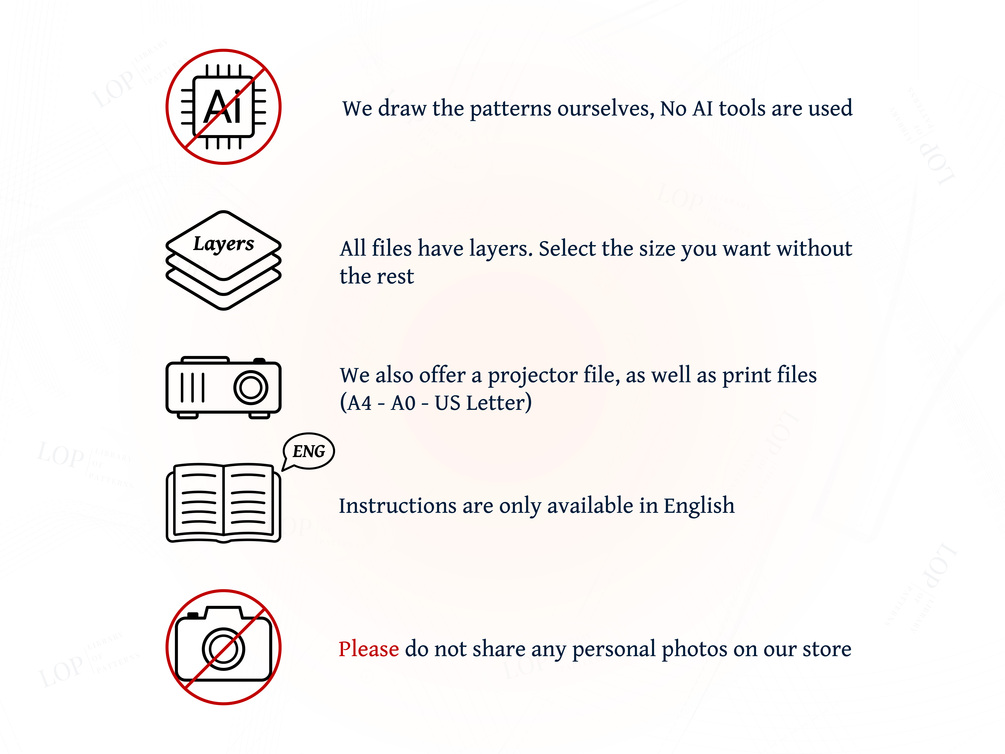 You will receive printable PDF files in A4, A0, and Letter sizes, along with a projector file and written instructions on how to sew